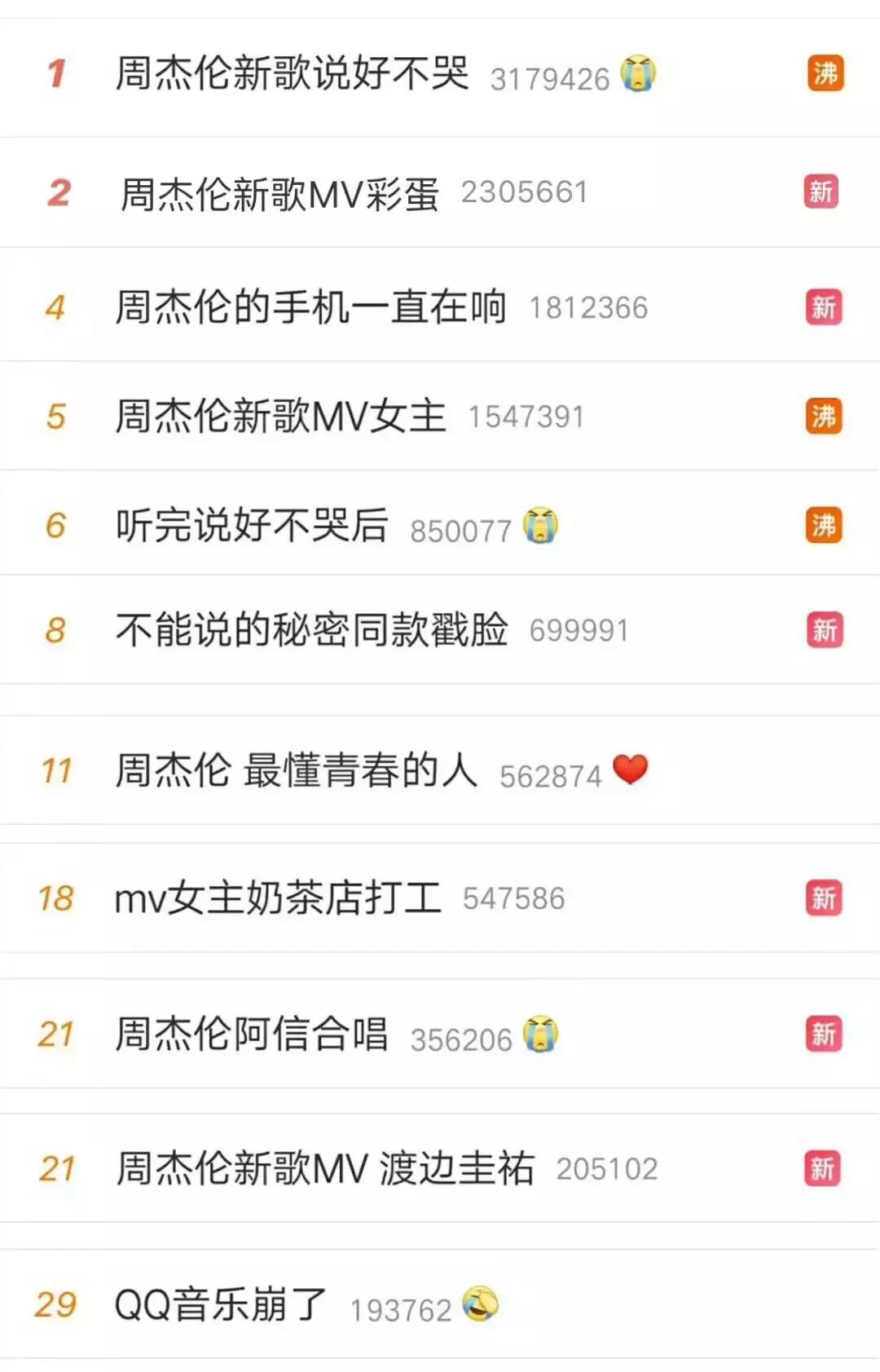 《说好不哭》刚上线1分钟就直接让QQ音乐搜索功能瘫痪,上线1.5小时微博热搜破10亿。
