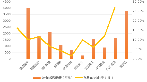 ▲2017年10家同等规模上市公司支付的各项税费用及占比(单位:万元,%)